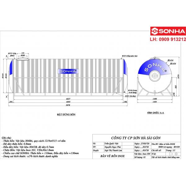Kích thước bồn nước inox 8000L Sơn Hà ngang