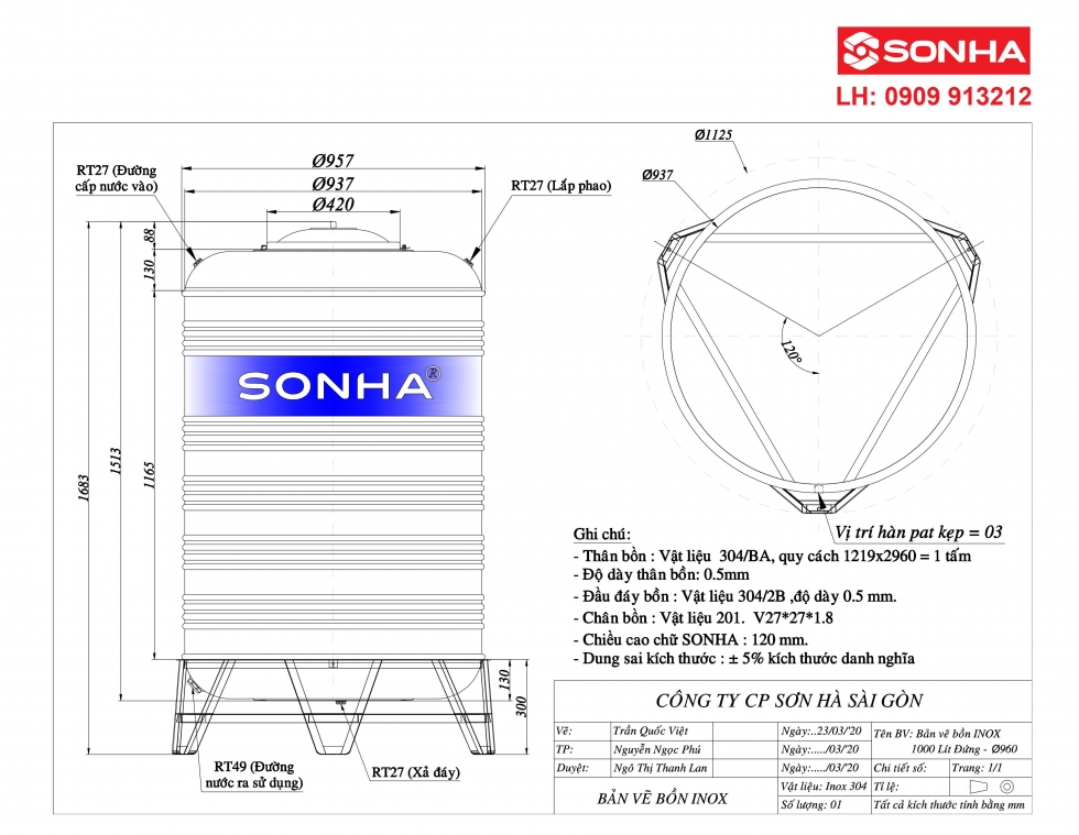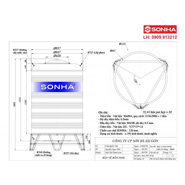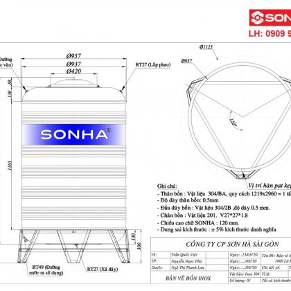Bản vẽ bồn nước inox Sơn Hà 1000 lít đứng