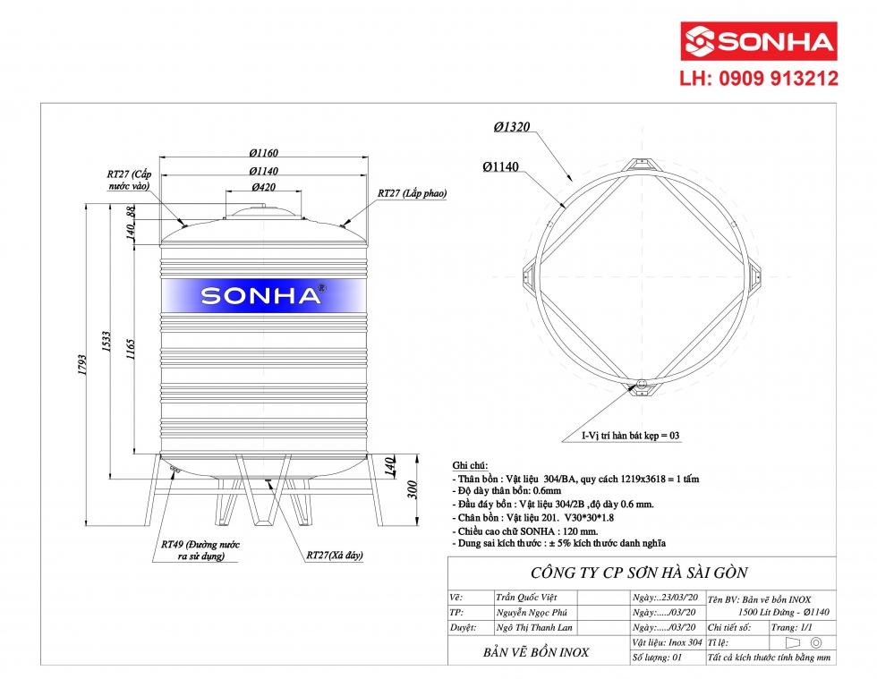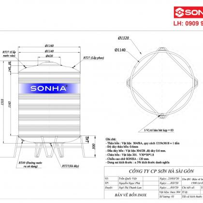 Bản vẽ bồn nước inox Sơn Hà 1500 lít đứng