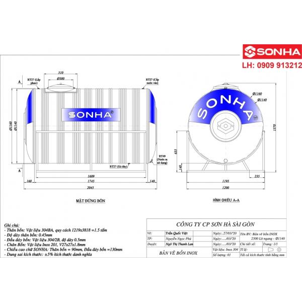 Bản vẽ bồn nước inox Sơn Hà 2500L ngang