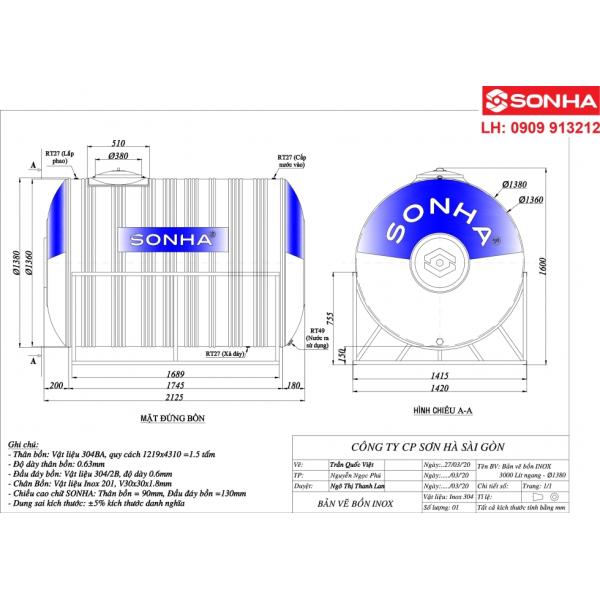 Bản vẽ bồn nước inox Sơn Hà 3000L ngang