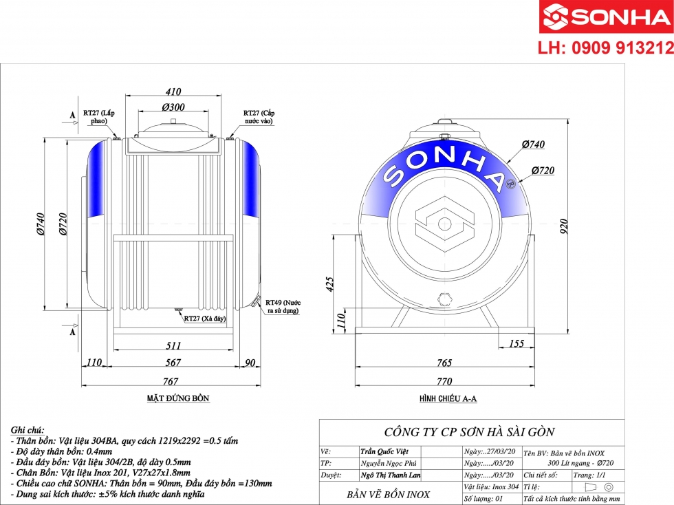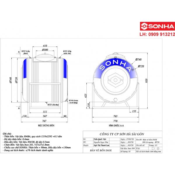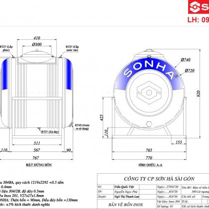 Bản vẽ bồn nước inox Sơn Hà 300L ngang