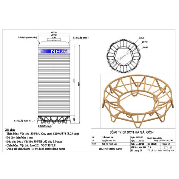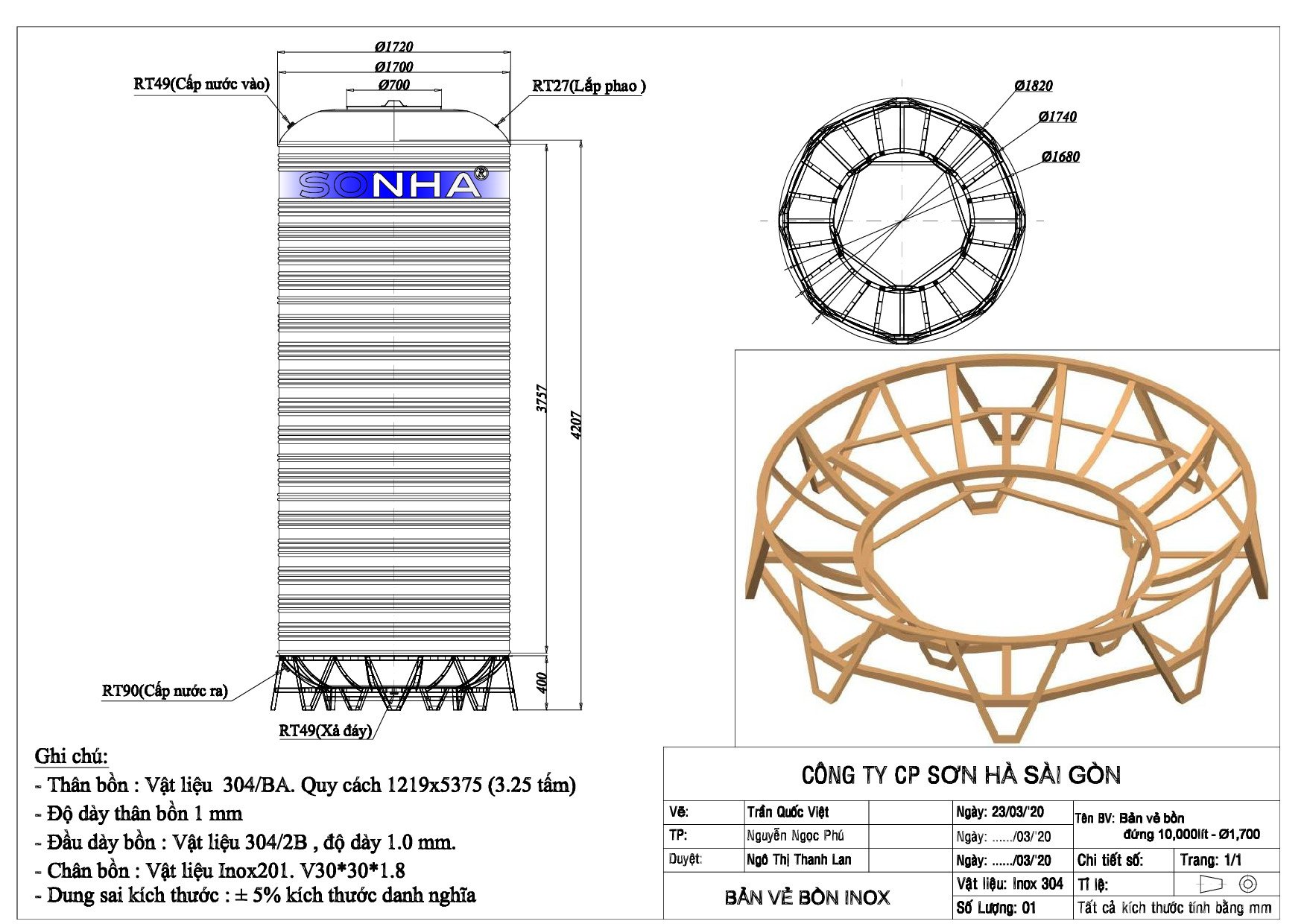 Lưu ý: Thông số kỹ thuật bồn nước inox 10000L nêu trên có dung sai ±5% (theo bản công bố chất lượng sản phẩm). Các thông số trên có thể được thay đổi bởi nhà sản xuất mà không cần báo trước.