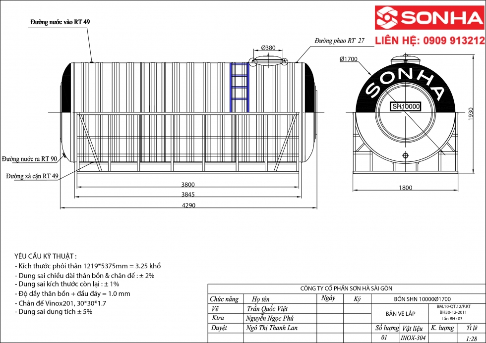 Tiêu chuẩn kỹ thuật của bồn nước inox 10000 lít Sơn Hà