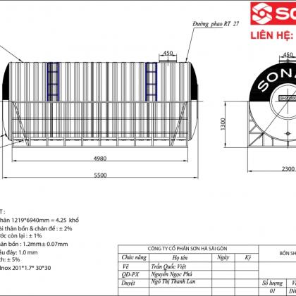 Kích thước bồn nước inox 20000L Sơn Hà nằm ngang