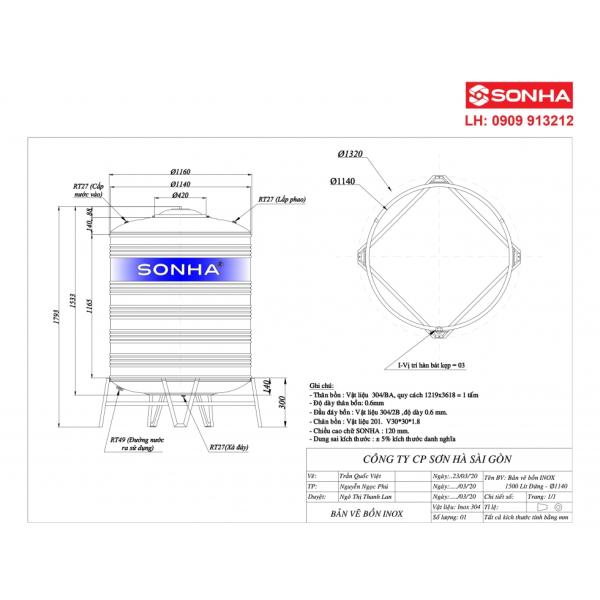 Bản vẽ bồn nước inox Sơn Hà 1500 lít đứng