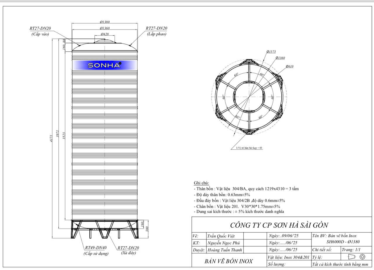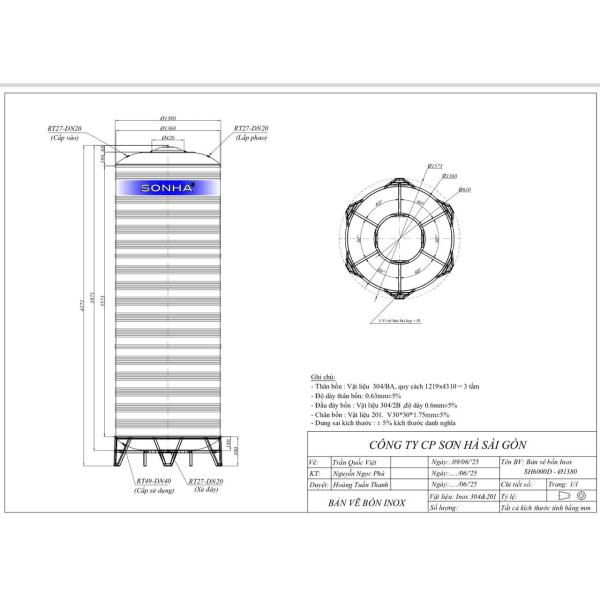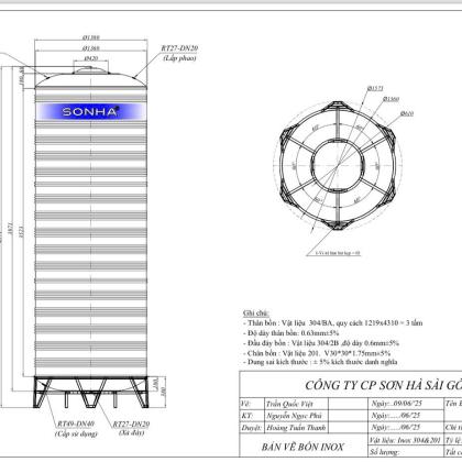 Bản vẽ bồn nước inox Sơn Hà 6000L đứng