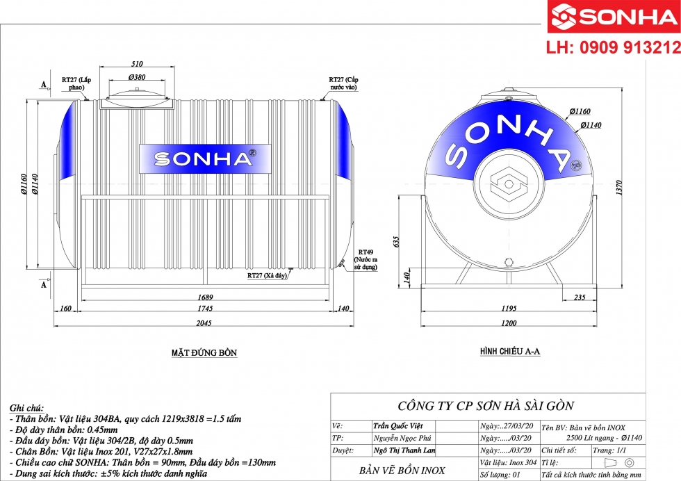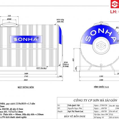 Bản vẽ bồn nước inox Sơn Hà 2500L ngang