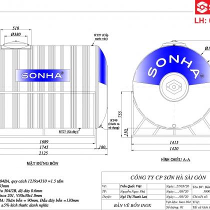 Bản vẽ bồn nước inox Sơn Hà 3000L ngang
