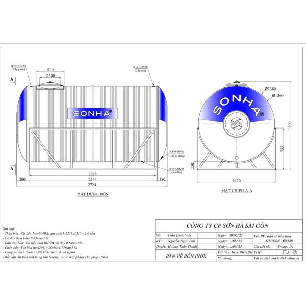 Bản vẽ bồn nước inox Sơn Hà 4000L ngang