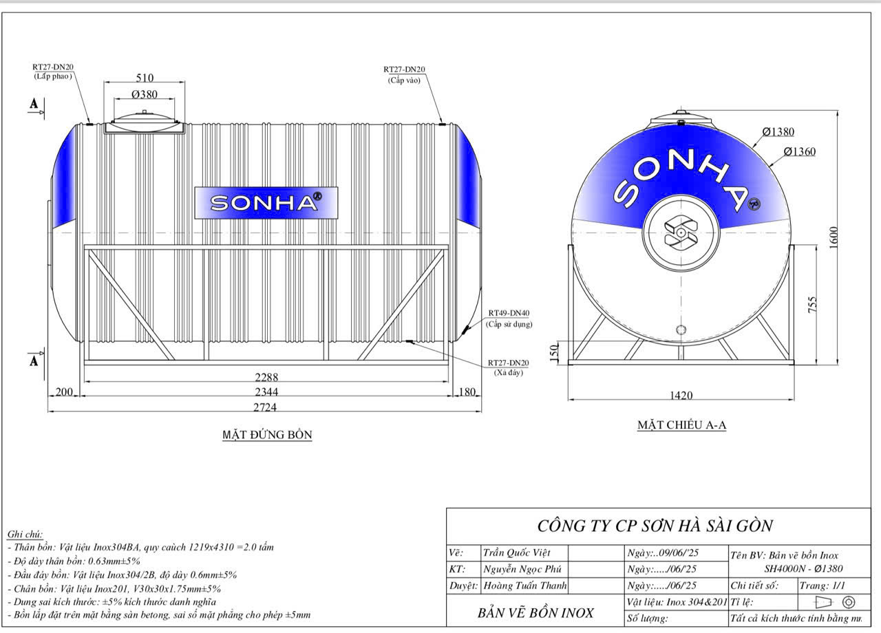 Tiêu chuẩn kỹ thuật của bồn nước inox 4000 lít Sơn Hà