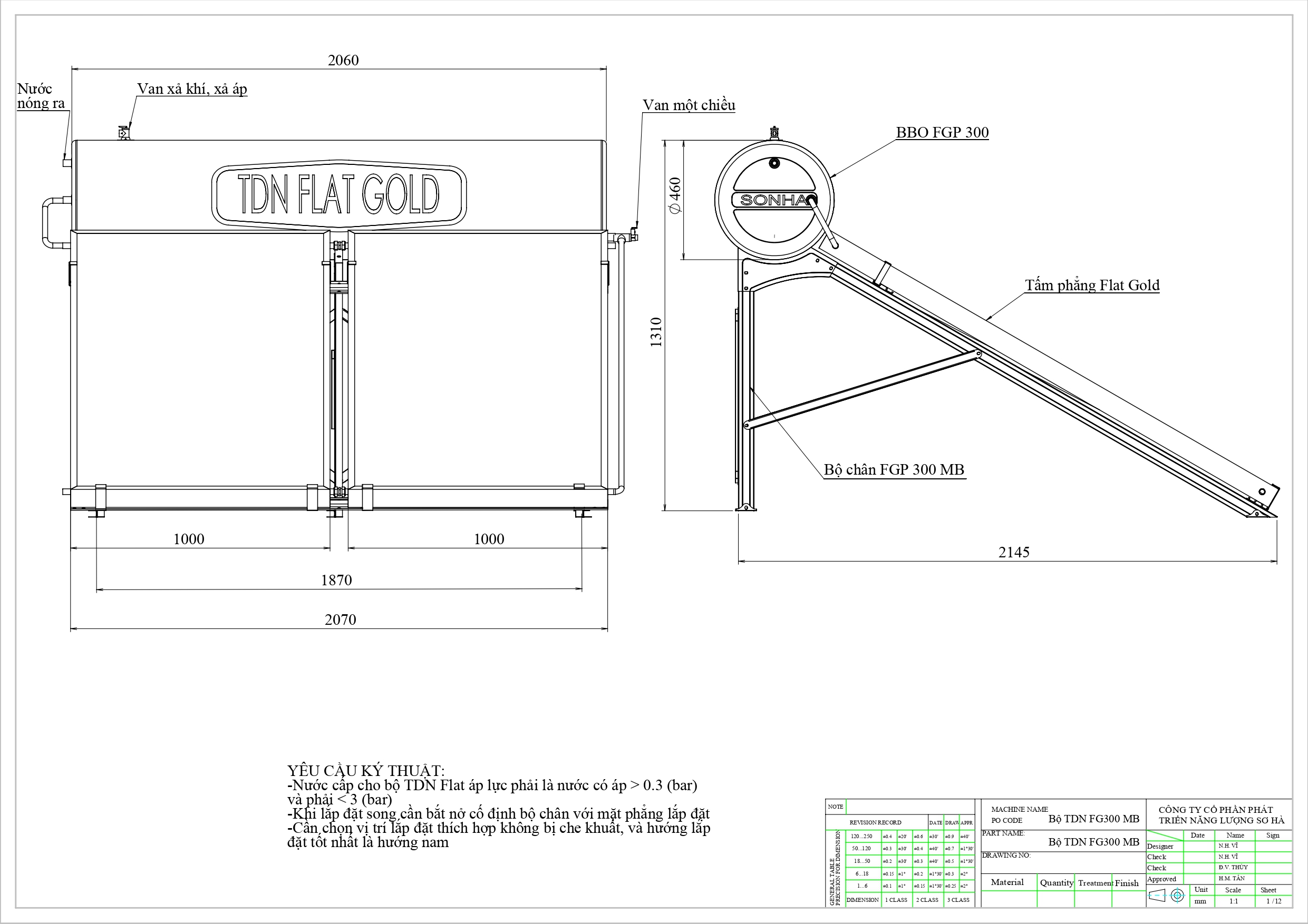 Thông số kỹ thuật của máy tấm phẳng chịu áp Thái Dương Năng Sơn Hà 300 lít